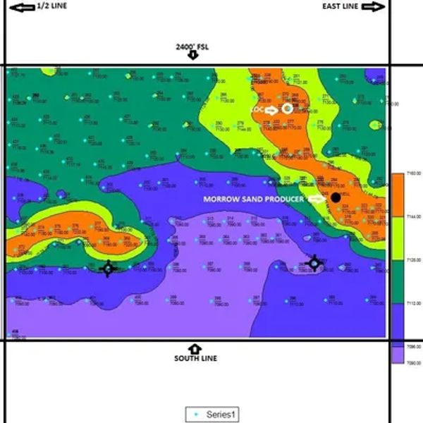 The objective of this KS study was to lock onto the productive part of a Morrow Sand Channel, trace it across the tract shown and locate a potential offset to the existing producer. As you can see, the productive part of this channel is very narrow but HMPA had the resolution to identify reservoir boundaries.