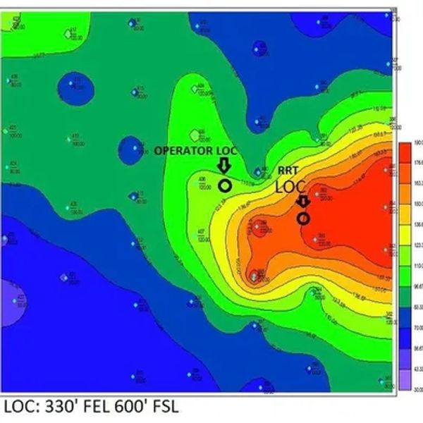 This is an example of a drill site evaluation we performed over a predetermined 3-D seismic location in NW Kansas. Red represents the strongest areas while blue and purple areas are least prospective. Our suggested drill site is shown as “RRT LOC”. The operator chose to go against our advice and drill the 3-D pick as shown. It was reported as a dry hole.