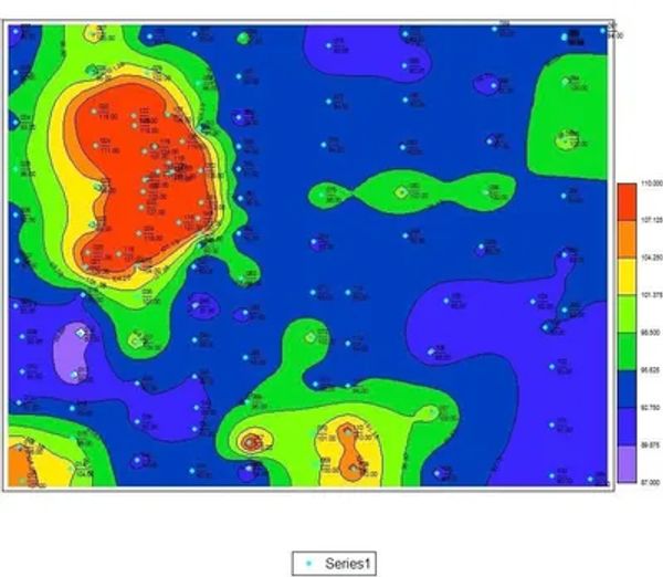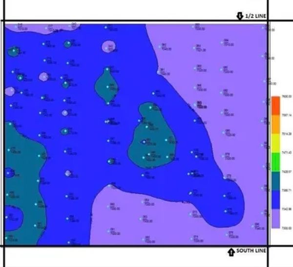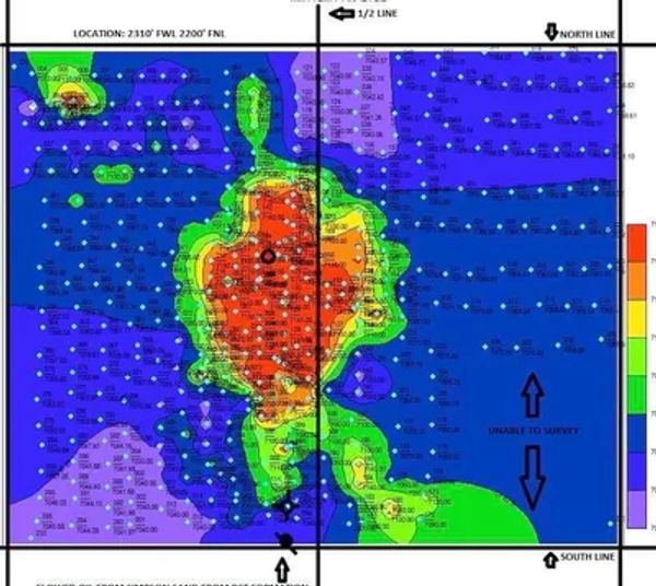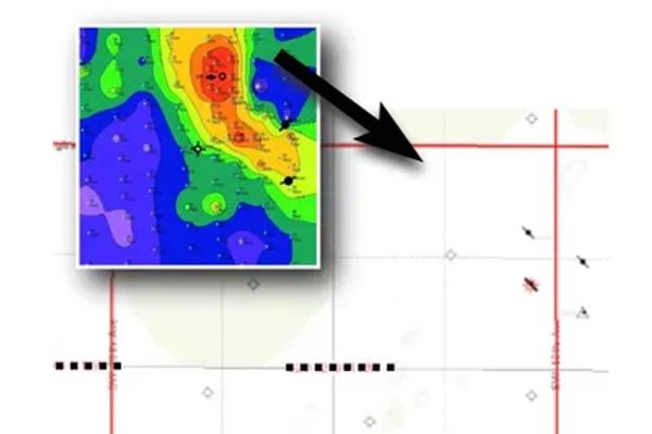 This example of a quarter section survey we conducted shows the probable depletion of a hydrocarbon reservoir. HMPA is useful in determining an offset location to an existing well