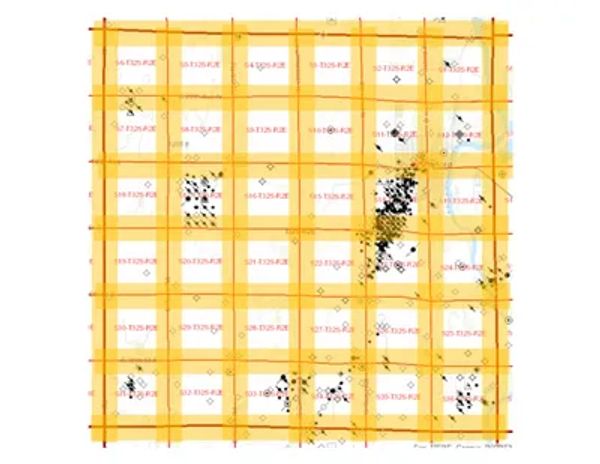 In the township map shown, HMPA would have identified the majority of these existing oil pools from the roads. Note how portions of each oil pool lie within the yellow shaded "detection area" of a road survey. Assuming the road studies detected the main producing features on this map, about 14 sections would be required to lease. HMPA evaluations would then be conducted infield to confirm road features and identify drill sites. With this approach, only acreage that is prospective is leased and tested in-field (no wasted acreage costs). Now, if using 3D, you are only shooting prospective areas that HMPA has already identified as "oil bearing".