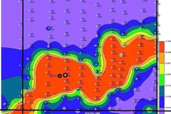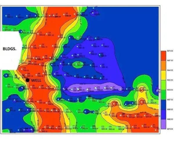The HMPA instrument responds in real time and once field data is gathered, a color contour map representing the results of the study is generated. Unlike 3-D studies where you have multiple map sets looking at time, depth, Isochrons, etc., the HMPA map set consists of one map as we are looking for oil or no oil, simply put. As you view our maps remember that HMPA technology does not look for structure; it identifies where the thickest oil columns exist at depth. Red represents the strongest areas while blue and purple areas are least prospective.