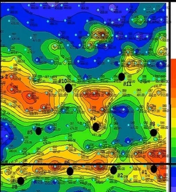 This map is of an actual survey conducted over an old field. The red areas show where the most residual oil exists. Based on this study, HMPA results indicated a possible frac job on the #1 and #4 wells, or laterals going north of #4 and east of #1. Results also suggested a possible new location west of the #10 well.