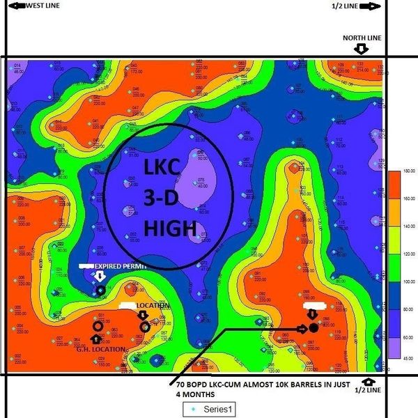 This is a text book example of how we find oil on the flanks of 3-D highs. In the middle of this tract is a Lansing-KC formation 3-D High. Highs like this drilled around this tract have yielded dry holes because the formation was too high and “tight”. This operator took a chance on this tract and drilled on the flank and got a fantastic well.